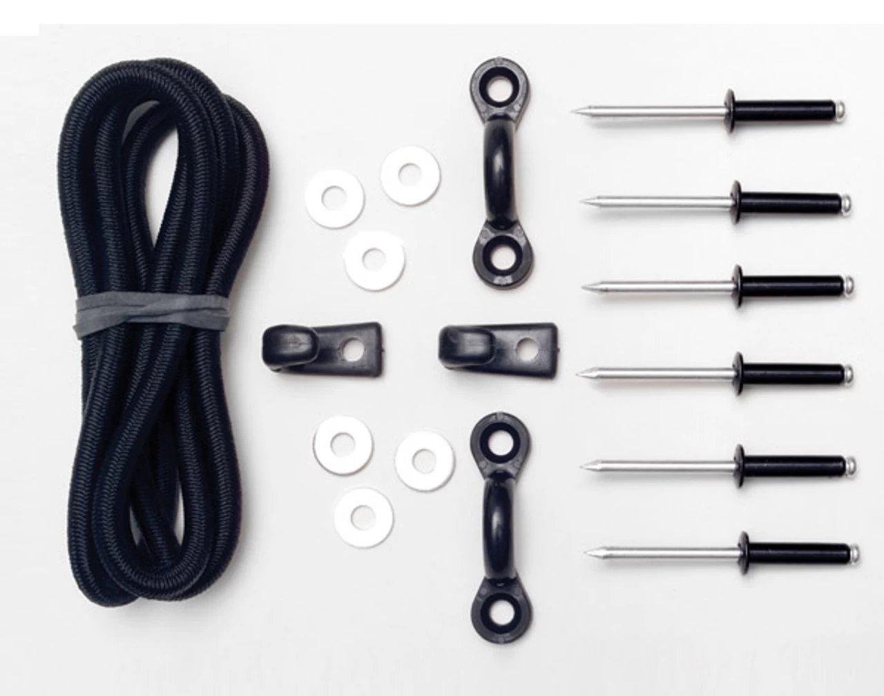 A simple and efficient way to secure your paddle or fishing rod. The kit includes: shock cord, two strap eyes, two lash hooks and rivets. Many option of how to install based on your need . Great for all recreation or fishing kayaks.