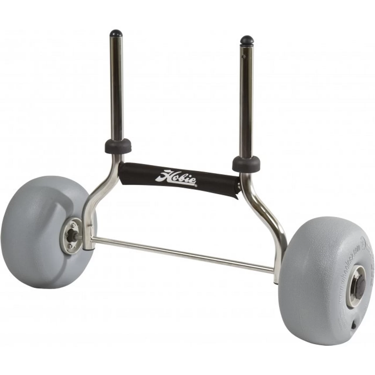 The Hobie Trax 2-30 Kayak Cart has new 30 cm (blow-molded polyurethane) pneumatic tires. These tires have a higher capacity and are very durable! The rim is a smaller diameter which gives a larger sidewall to prevent pinching and valve damage under heavy loads. The pressure range is double that of the original Trax wheels (now 3-4 lbs) which is easier to maintain. The Hobie Trax 2-30 Cart has a 242 lb capacity. This is the best all around cart for soft sand and uneven terrain. The tires are wide and can be deflated for better performance over soft sand and soil. Welded Stainless steel construction, solid stainless axle. Wheels are easily removable for storage. Also includes cart keeper feature and cart clamps. To use the Trax 2-30 cart with a Tandem Island requires the use of the Tandem Island “Plug-In” Cradle to disperse the load.