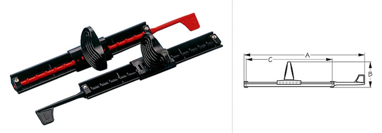 Kayak foot brace with a red adjusting rod made of engineered polymer. Easy adjusting and self cleaning, through-hull mount, 14 and 1/2 inches.