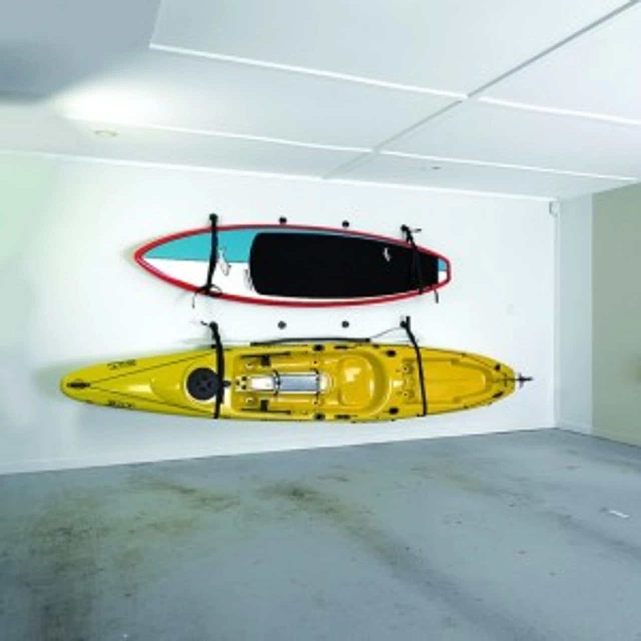 Storage of a wide range of watercraft, including SUPs, canoes, windsurfers and kayaks just got quicker and easier with the RAILBLAZA StarPort Wall Sling. The StarPort Wall Sling will free up space in your garage, shed or yard by allowing you to hang your craft on the wall. You can hang it outside on one pair of StarPorts to wash down, and then easily transfer it to another pair of StarPorts inside to keep it warm and dry! If you want to use your sling at another location like your holiday home it’s as cheap and easy as fitting two more StarPorts. Installed in minutes and supplied with StarPorts, slings, adjustment buckles and screws the StarPort Wall Sling is great value for money.