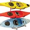 Your kayak is suspended on durable nylon straps protecting boats from abrasions, dents and hull distortion with built in safety straps and locking pins. They are manufactured using commercial grade powder-coated steel giving you a sturdy and durable rack. Sleek black suspension arms with safety yellow pivot arms for enhanced visibility.