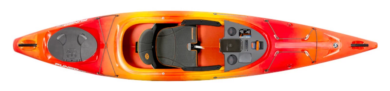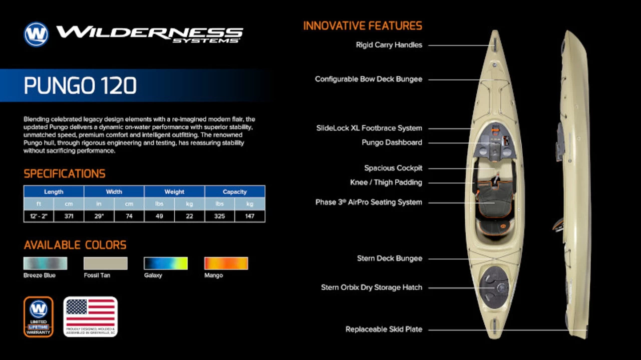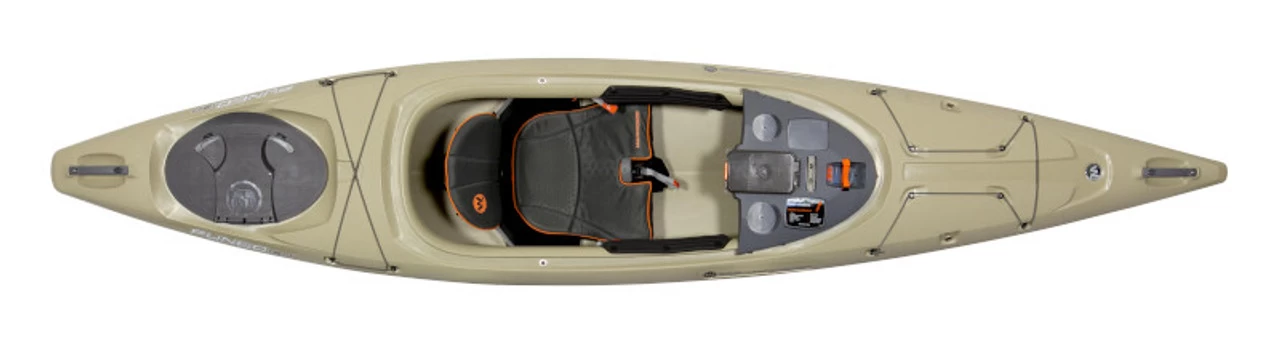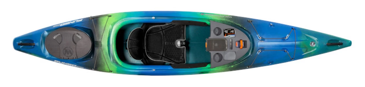 The patented Phase 3® AirPro seating system is the core of what makes Wilderness Systems the world’s most comfortable kayaks; the Pungo’s comfort and adjustability is built just for you, allowing you to be fully immersed in your on-water experience. The Pungo also integrates the most interface for optimal customization and features. It includes the removable DryTec dry box that allows you to take your valuables with you, two cup holders for your favorite beverage, a recess for the Wilderness Systems Lithium Battery (sold separately), SlideTrax ™ to hold mounts for phones, fishing rods and other accessories, and two mounting platforms for customized accessorizing. A protective and replaceable skid plate, comfortable rigid carry handles, industry-leading storage capabilities, and configurable deck bungee rigging rounds out a robust list of attributes.